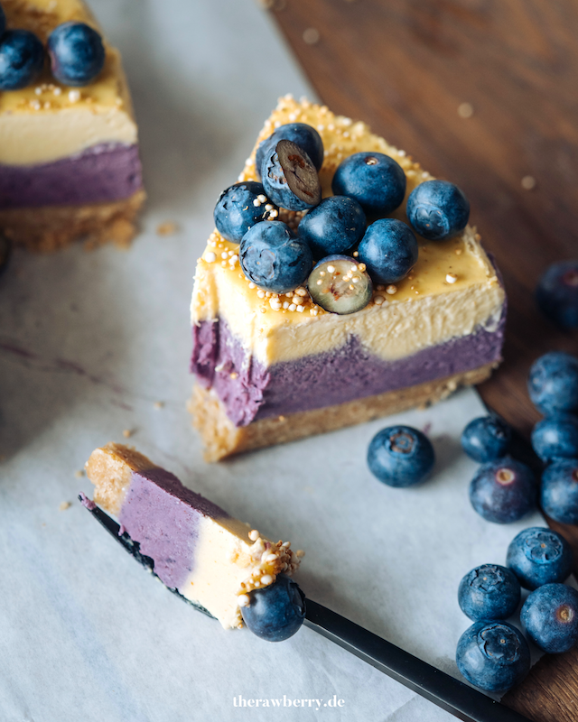 Super leckerer Käsekuchen mit Orange und Blaubeeren. Komplett vegan, glutenfrei und ohne backen. HIER geht’s zum Rezept 🌱