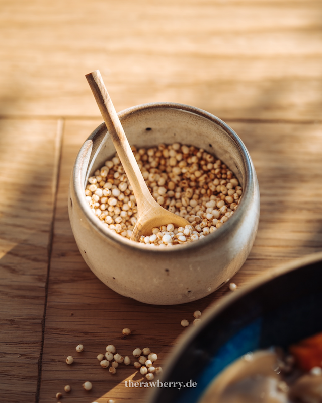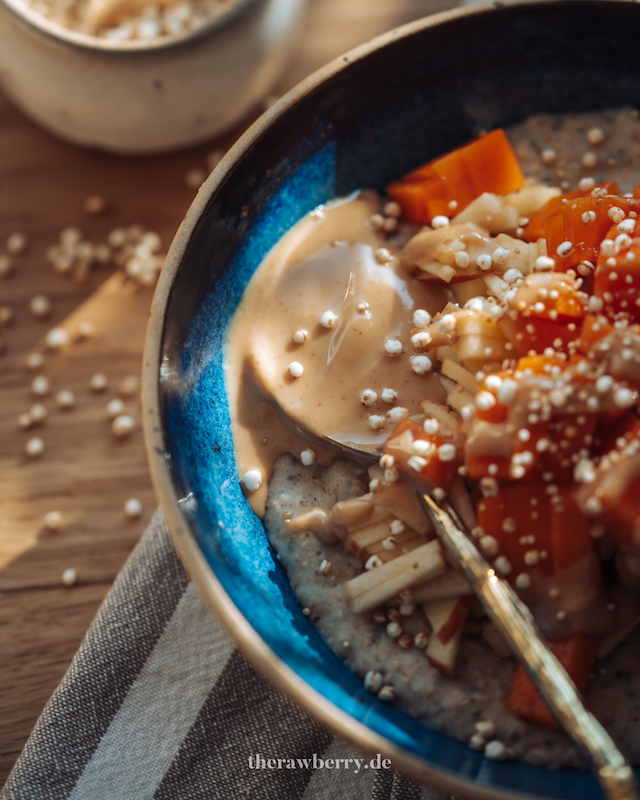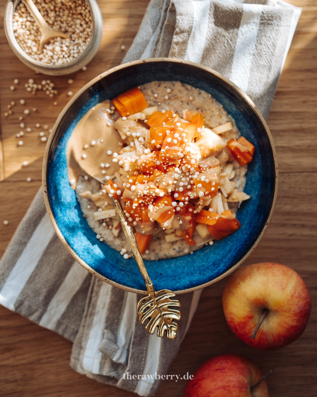 Hier kannst du gerne Zimt, Kakaopulver, oder Gewürze und Süße deiner Wahl hinzugeben. Ich belasse es meistens aber so wie es ist.