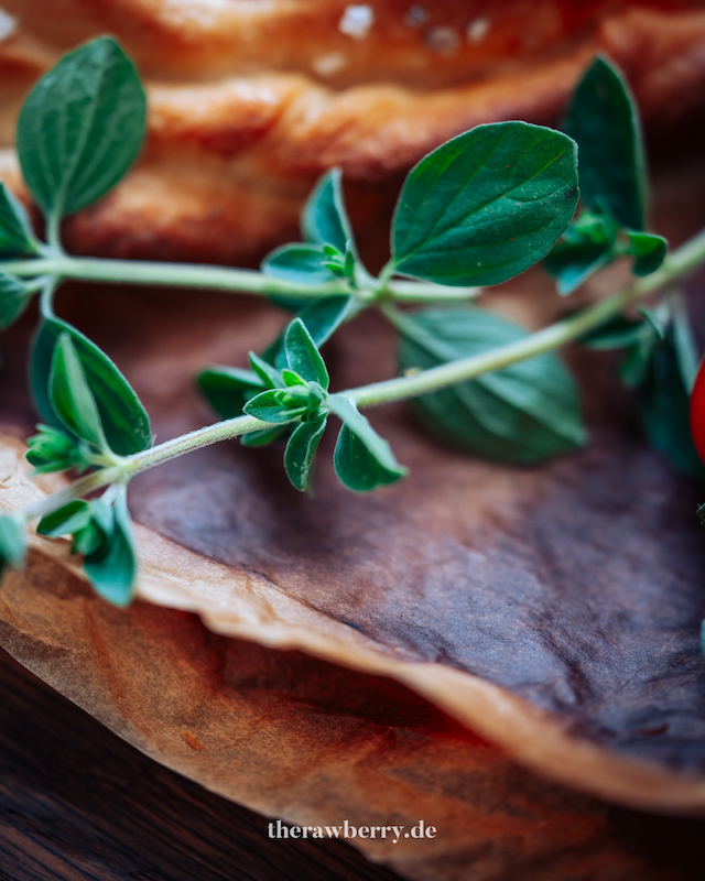 Frische Kräuter wie Basilikum, Thymian und Oregano geben der Tarte einen wunderbaren Geschmack. Um ihren vollen Geschmack zu bewahren und ein Verbrennen zu vermeiden, solltest du die meisten Kräuter erst kurz vor dem Servieren hinzufügen. Einige kannst du jedoch bereits vor dem Backen auf die Tomaten streuen, um dem Gericht zusätzliche Aromen zu verleihen.