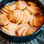 Dann den Teig in die Form geben und mit den Kakis toppen. Dabei leicht andrücken.