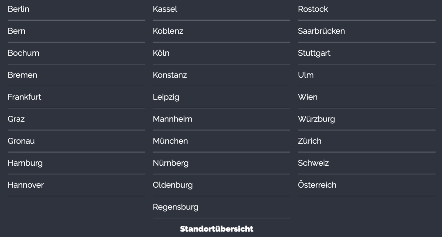 Für die abschließende Prüfung gibt es zudem auch viele Standorte. Dies entfällt bei der Ernährungsberatung, da diese online stattfindet. Aber ich liste sie euch trotzdem einmal kurz auf: