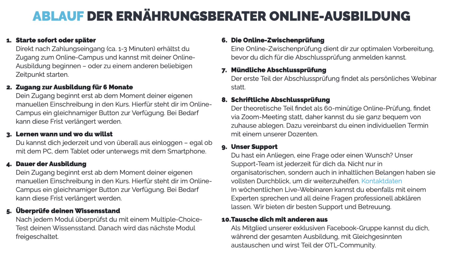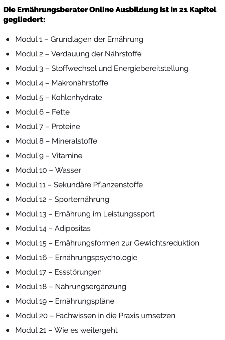 Deshalb habe ich mich bei der Ausbildungsakademie Online Trainer Lizenz für den Kurs „Ernährungsberaterin“ angemeldet. Mit einem Aufbau, nicht nur zur Ernährungsberaterin, sondern dann schlussendlich als vegane Ernährungsberaterin. So sieht das in den einzelnen Modulen aus: