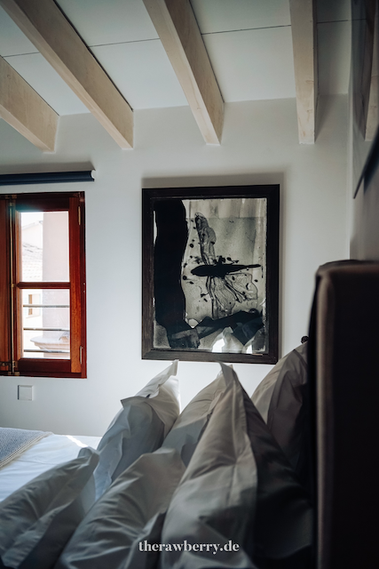 Die Zimmer Zimmer sind übrigens ein weiterer Traum für sich. Die 6 einzelnen Räume sind je einem Thema gewidmet: “Love”, “Believe”, “Sense”, “Imagine”, “Dream” und “Fly”. Ich hatte die Ehre, zusammen mit meiner Geschäftskollegin Nici im 32qm großen “Love” Zimmer untergebracht worden zu sein. Der Raum hat einfach alles, wovon man in solch einem entsahnenden Urlaub träumt: 3 große Fenster, 2 davon zur Straße herunter, mit einer wundervollen Aussicht. Ein unglaublich bequemes Bett mit Blick auf die restaurierten Balken unterm Dach.
