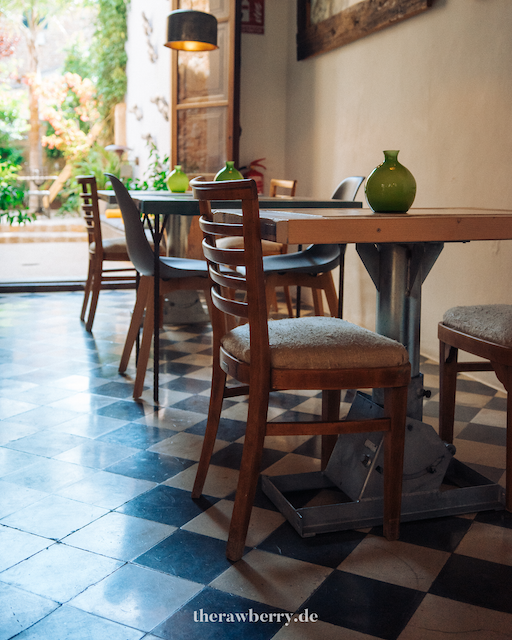 So gelangt man übrigens zum Innenhof. Mit wundervoll gedeckten Tischen, von denen jeder anders ist und keiner ein Tisch von der Stange. Der eine Tisch hat eine Marmorplatte, die an der langen Kante nicht ganz perfekt ist. Woher die wohl ist? Die gesamte Unterkonstruktion erinnert an eine alte Nähmaschinen Bank, bei der noch mit dem Fuß gekurbelt wurde. Dies liegt gefühlt in der Generation meiner Oma. Aber das Zusammenspiel ist einfach nur Kunst pur und ein Traum, da alles in sich und miteinander stimmig geklungen hat.