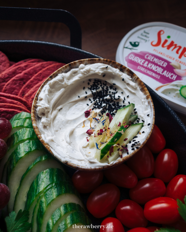 Wenn ich meine Platte so anschaue, dann ist sie ja stark einem griechischem Thema entsprungen. Mit den Oliven den Tomaten und vor allem durch den Streichgenuss “Cremiger – Gurke & Knoblauch” (Typ Tzatziki). Das passt natürlich zu diesem Aufstrich am besten. Vor allem finde ich es richtig toll, dass es bereits solche Alternativen auf dem Markt gibt. Ich habe mich hier für die vegane Streichalternative von SimplyV “Typ Tzaziki” entschieden. Mit ganz viel Gurke und Knoblauch – das hat perfekt zu meinem Thema gepasst. Schaut gerne einmal bei dem Produkt von SimplyV vorbei. Mehr Infos gibt es hier.