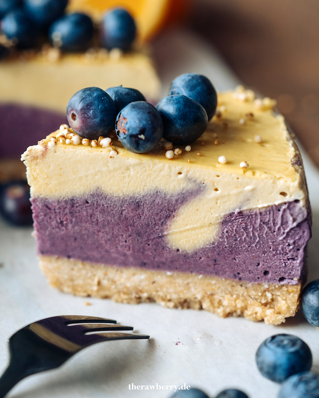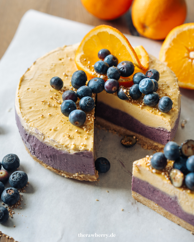 Super leckerer Käsekuchen mit Orange und Blaubeeren. Komplett vegan, glutenfrei und ohne backen. HIER geht's zum Rezept 🌱