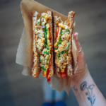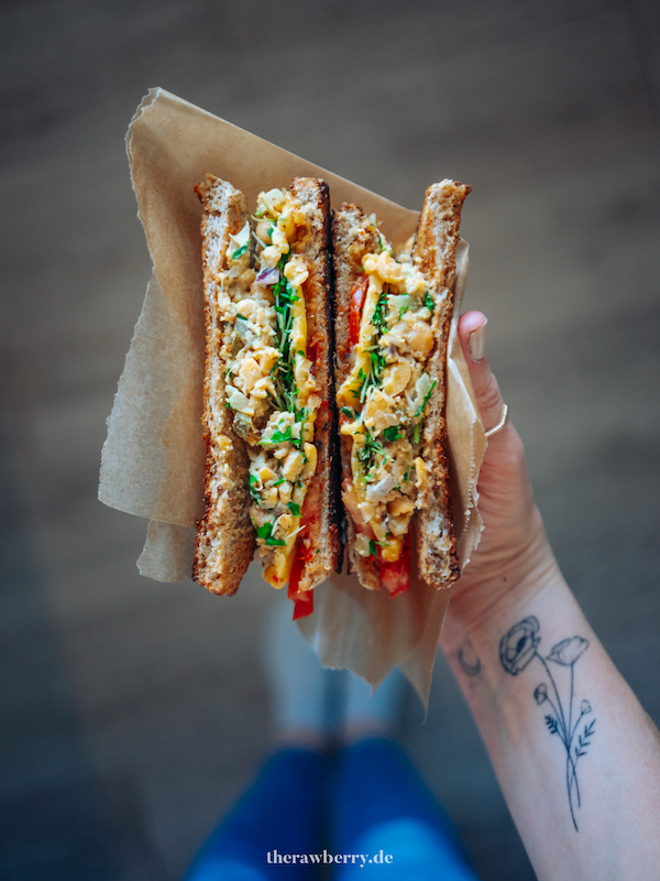 Der vegane “Thunfisch” ist in Wirklichkeit nichts anderes als Kichererbsen. Schön fein zerdrückt mit der Gabel. Daher kommt übrigens auch unser hoher Protein-Anteil des Sandwichs. Denn in Kichererbsen stecken bis zu 30% Proteine!