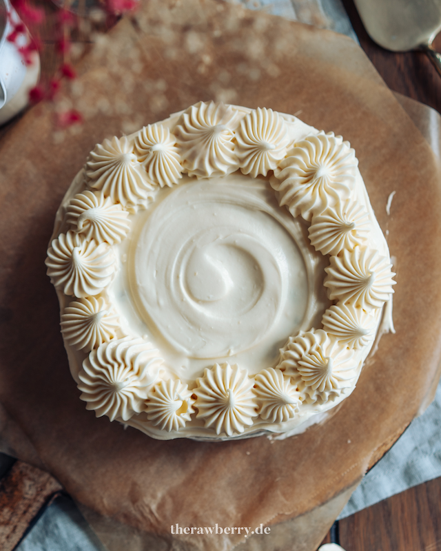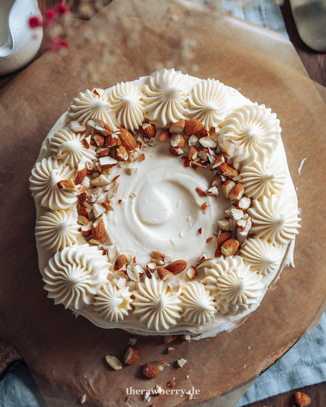 Das Frosting auf den Kuchen geben und nach Wünschen verzieren. Ich habe den Kuchen komplett eingekleidet und dann das restliche Frosting in eine Spritztüte gegeben und das ganze mit ein paar Mandelsplittern verziert. Viel Spaß!
