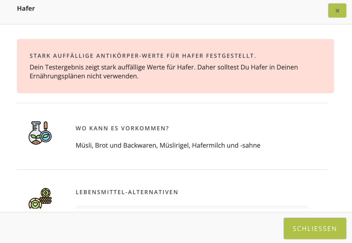 Des Weiteren kann man sich auch innerhalb der Auswertung die einzelnen Lebensmittel, worin sie vorkommen und was eine mögliche Alternative sein kann, erkunden.