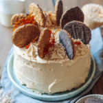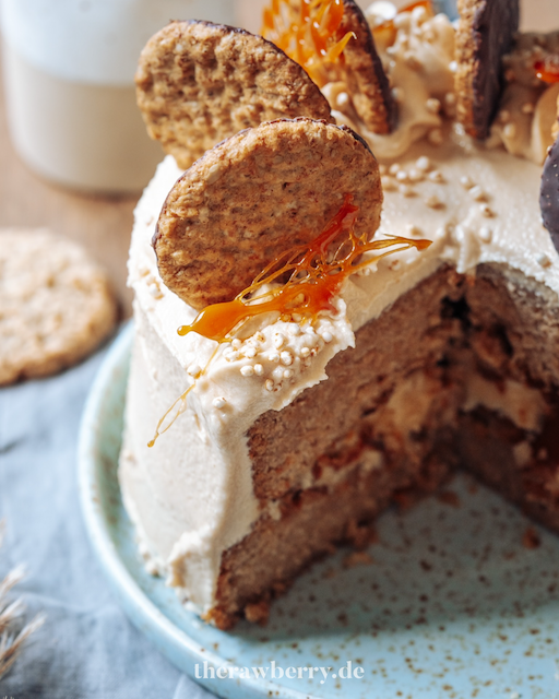 Den Kuchen mit der restlichen Buttercreme einkleiden und verzieren. Mit Hafer Cookies und Quinoa Pops dekorieren. Direkt servieren und genießen.