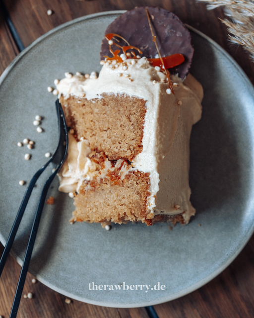Für die Buttercreme die vegane Butter und das Erdnussmus miteinander cremig rühren. Dann den Puderzucker darüber sieben und immer wieder unterrühren. Wenn nur eine Springform verwendet wurde, den Kuchen nun horizontal in der Mitte teilen. Auf den unteren Kuchen eine Schicht Buttercreme geben und glatt streichen.