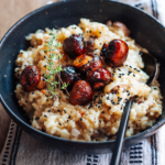 Die gehackten Champignons in deinen Topf geben und einige Minuten braten. Dann den Reis hinzufügen. Nochmals anbraten und mit Ahornsirup und weißem Essig ablöschen. Dann die Gemüsebrühe dazugeben und 20 min köcheln lassen.